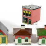 Westmoreland duplicated buildings from the neighborhood to make these tin buildings which had glass inserts and held candy. The tin was ordered with the lithograph in place and then assembled at the factory.