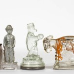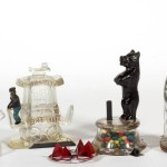 This selection of Westmoreland candy containers features the railroad lanterns on the top shelf and has a mailbox, opera glasses, candlestick, and a handled drum on the bottom shelf. These were produced from the mid-1900s through the 1910s.