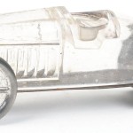 This very rare pointed racer candy container was made in the mid-1920s. When found it can be found in different period colors as well as clear glass as pictured.